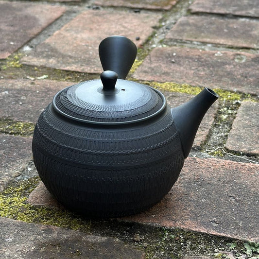 Teapot - GYOKKO Black Kiln-Change Fukuro Shape Engraved Lines