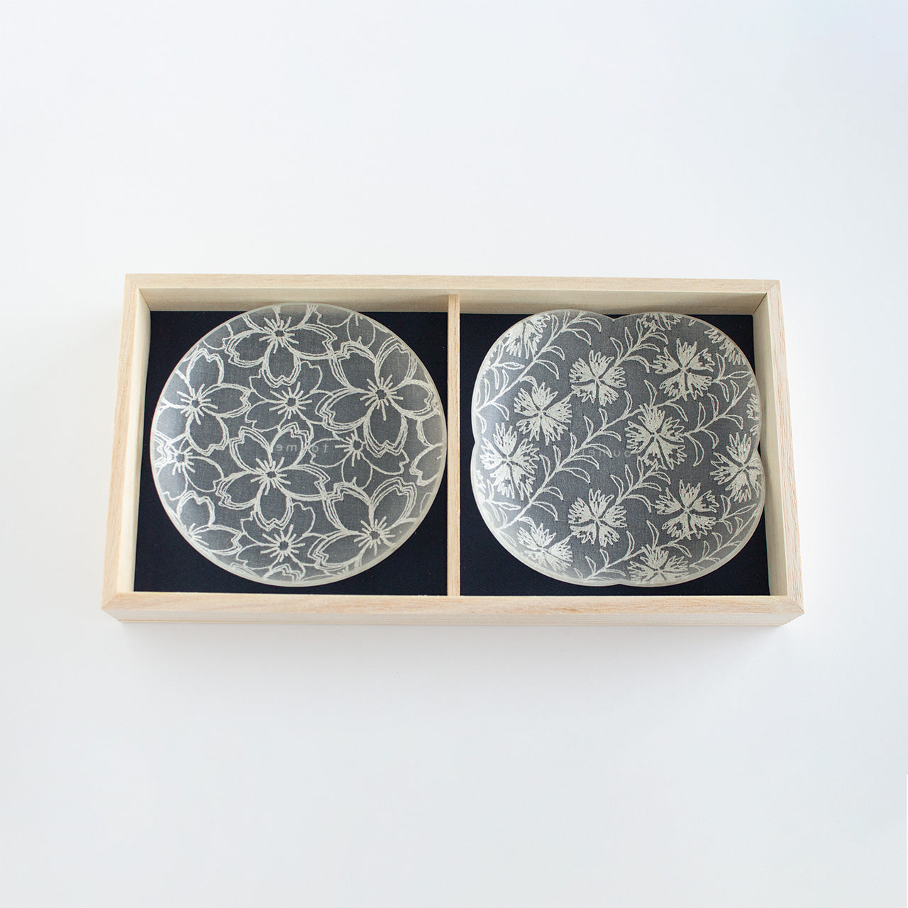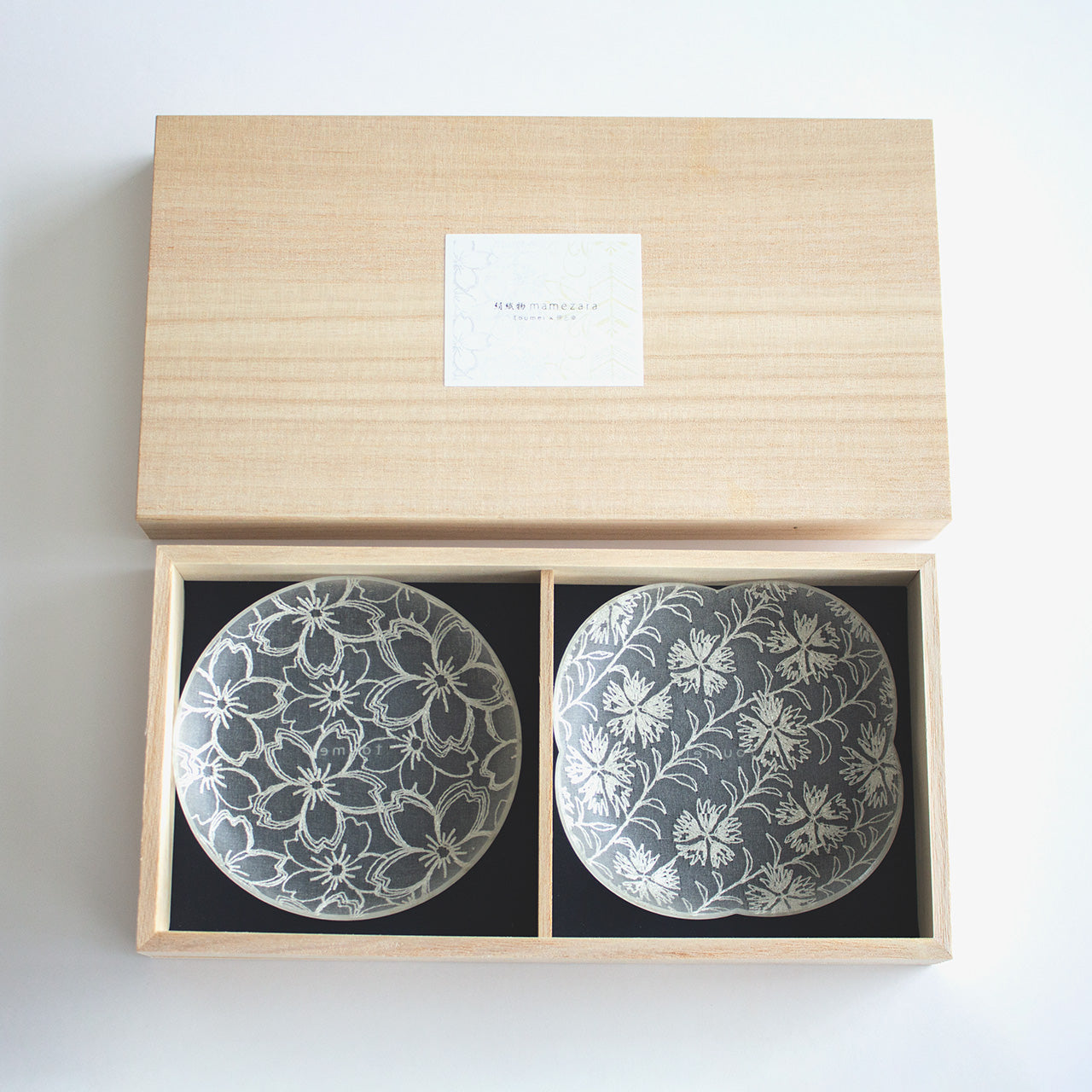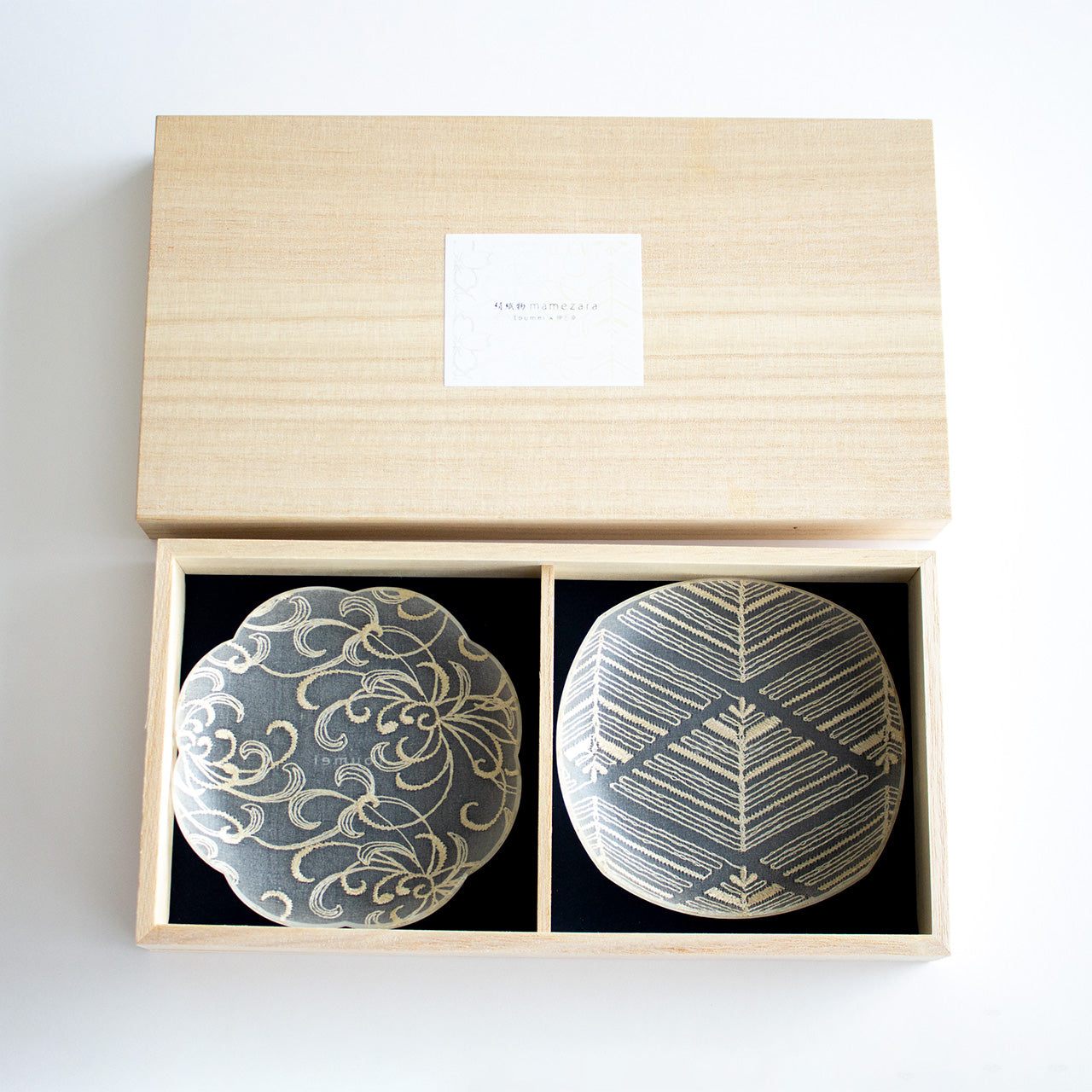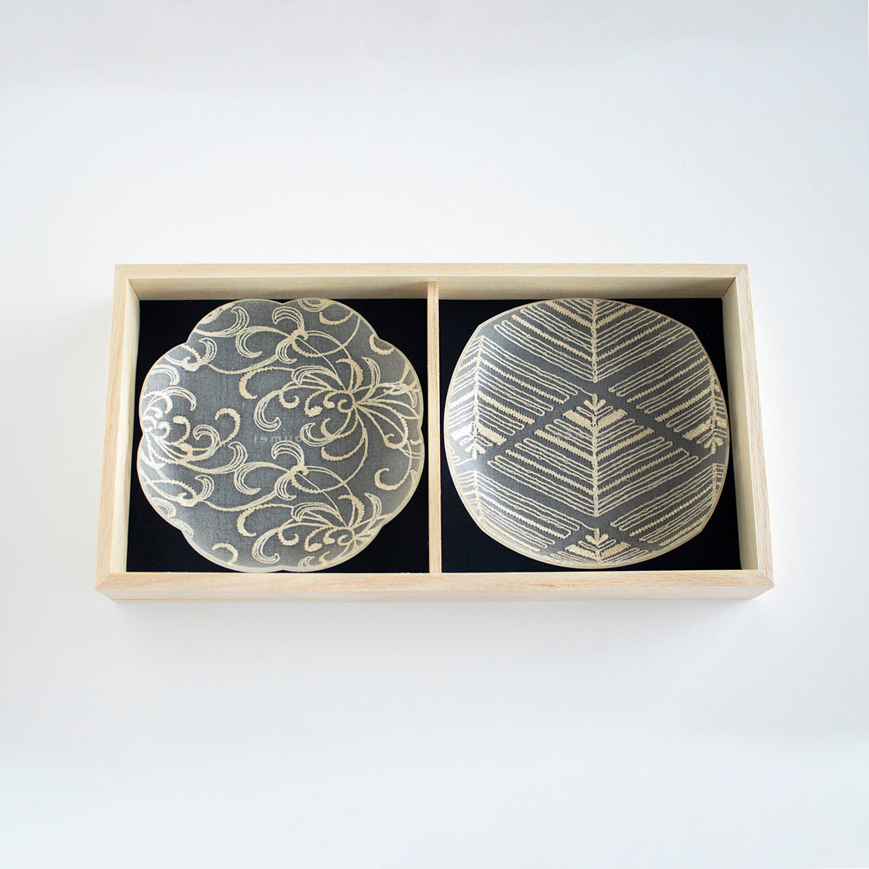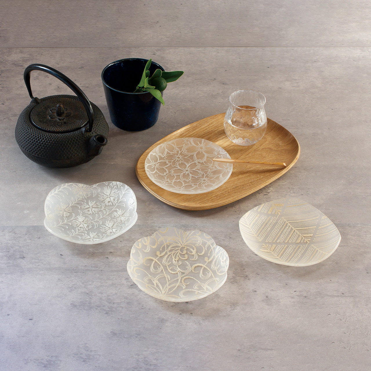 Eine Zusammenarbeit mit „toumei“, einer Marke, die verschiedene Harzprodukte aus einer einzigartigen Perspektive kreiert. Dieser kleine Teller wird hergestellt, indem dünner, mit Seide bestickter Stoff in Harz eingebettet wird, wodurch die zarte Schönheit und der Schimmer von Seidentextilien erhalten bleiben.