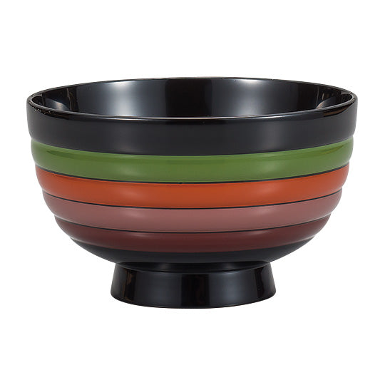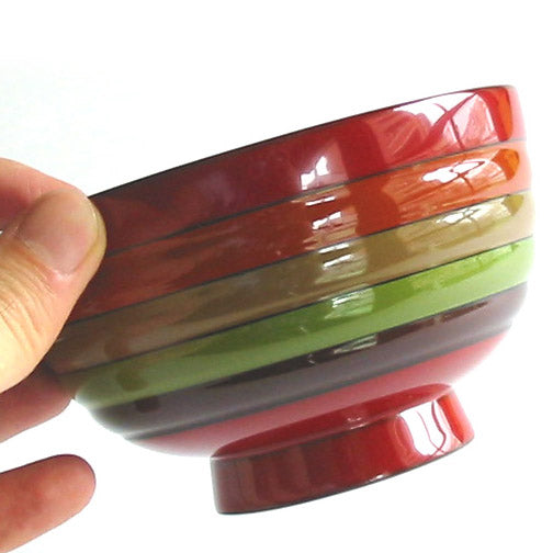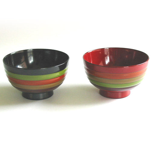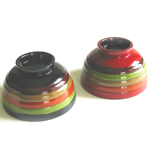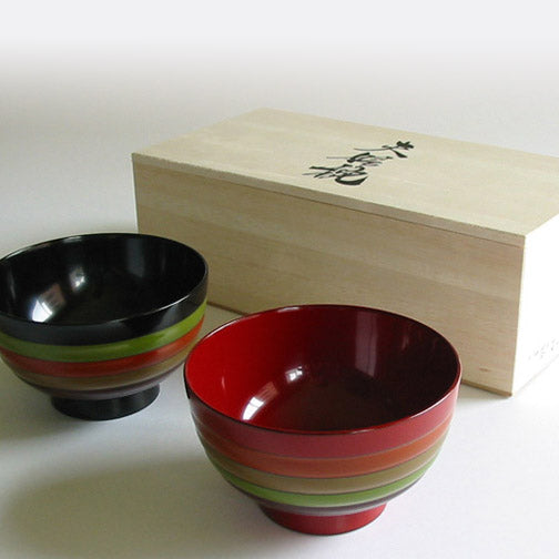 Diese gepaarten Suppenschüsseln sind eine empfehlenswerte Wahl für die Feier der Ehe und eignen sich perfekt für Anlässe wie Hochzeiten, Silberjubiläen und goldene Jubiläen. Das Kreiselmuster, das seit der Antike in Lackwaren verwendet wird, wurde durch die Schichtung verschiedener Lacktöne in einem frischen und innovativen Design nachgebildet. Traditionell symbolisieren Koma kommende Dinge und Glück, und in Kombination mit diesem leicht lebendigen Design haben diese Schalen bei jungen und älteren Empfängern großen Anklang gefunden.