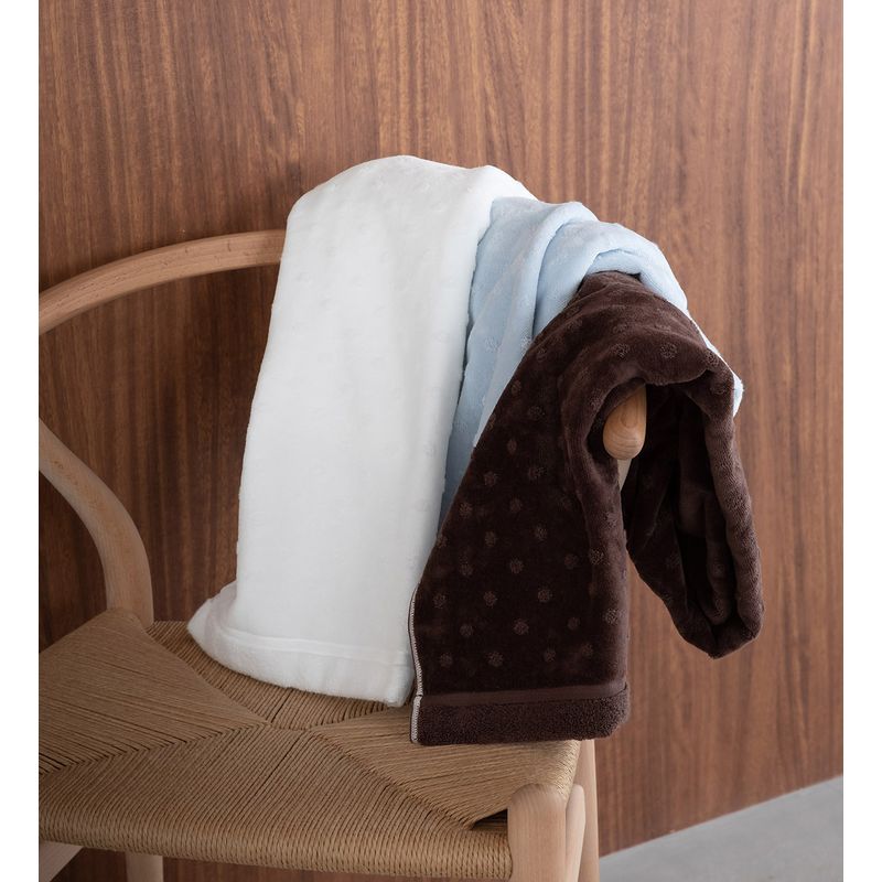 The glossy sheen of the shearing and the voluminous zero-twist yarn create a sense of luxury. This towel offers a smooth surface on one side and a soft, fluffy texture on the other, providing a truly comfortable feel. Its gentle color palette, paired with contrasting side-stitching, adds a touch of individuality.