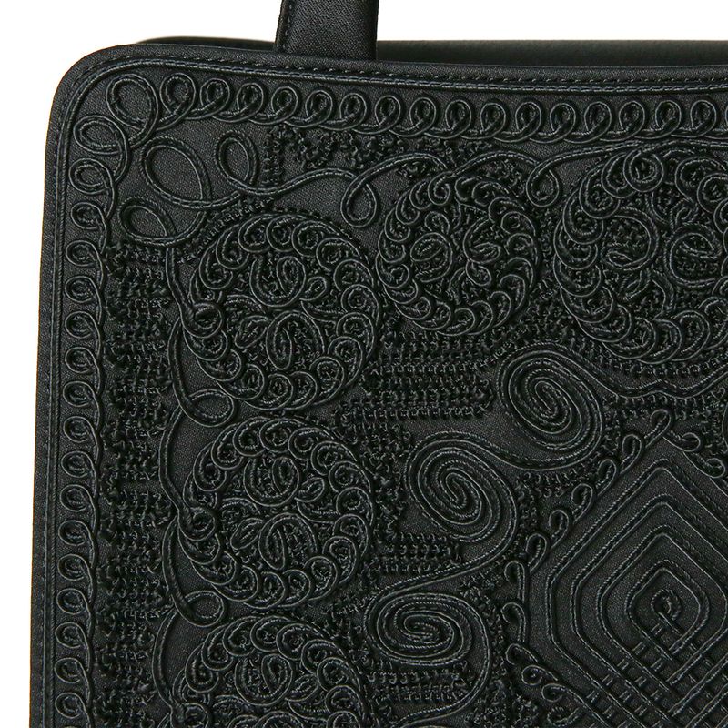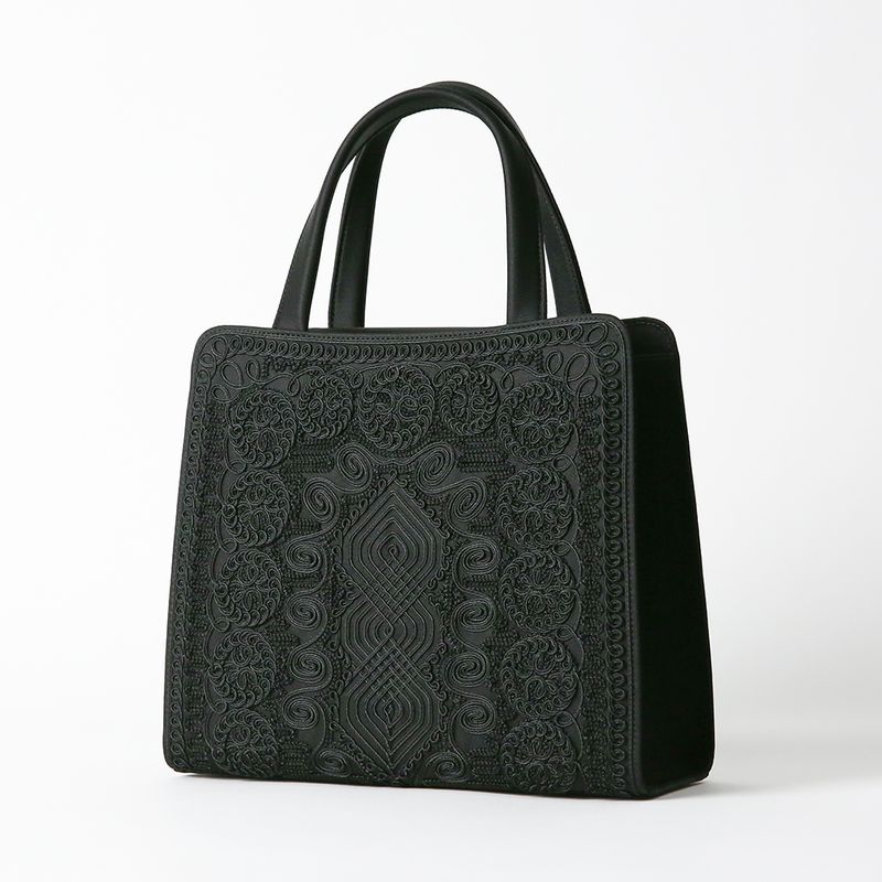 This formal bag is luxuriously adorned with abundant cord embroidery on both sides. Thin cords are sewn into various shapes to create intricate patterns, resulting in a beautifully decorated design. This is a labor-intensive technique that requires precision to make the patterns stand out in three dimensions, meticulously crafted by skilled artisans.