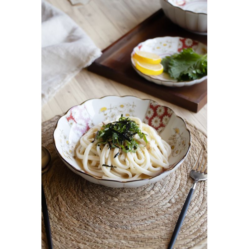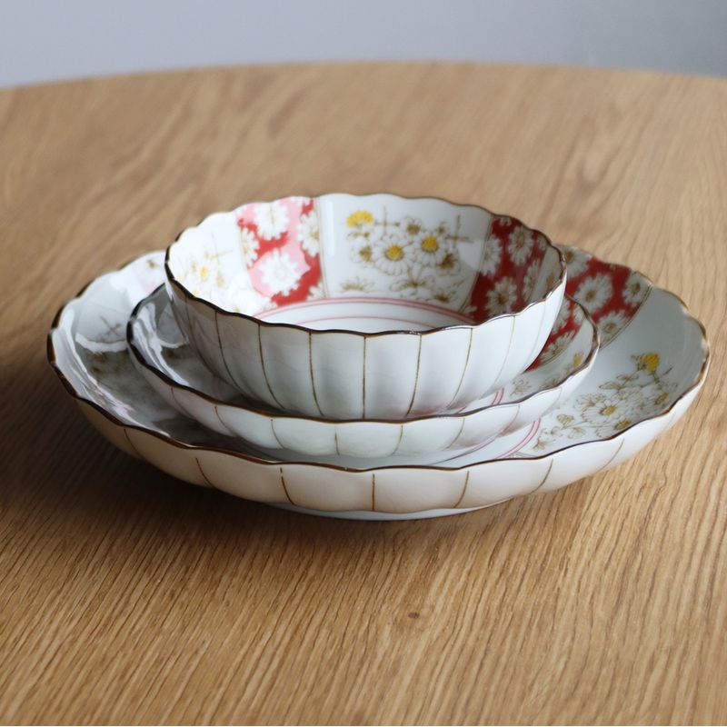 Chrysanthemums delicately depicted in a cute color scheme adorn dishes shaped like chrysanthemum flowers, suitable for various dishes. Bring the Japanese 'chrysanthemum' into your daily dining table. This set of three dishes, perfect for hospitality and solo dining, includes main plates, serving plates, and small bowls, designed to meet various needs.