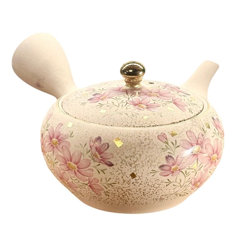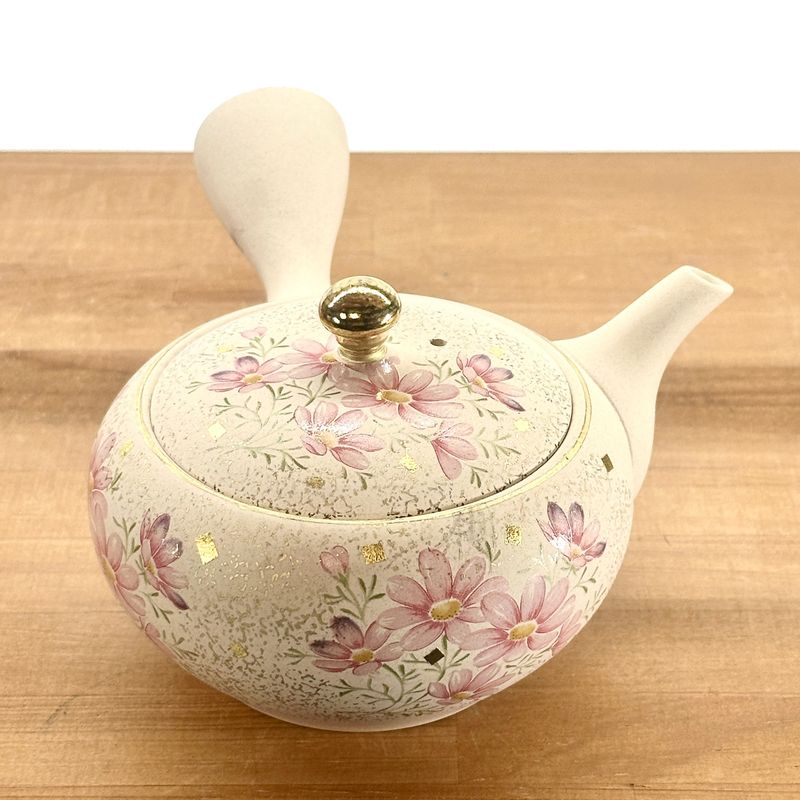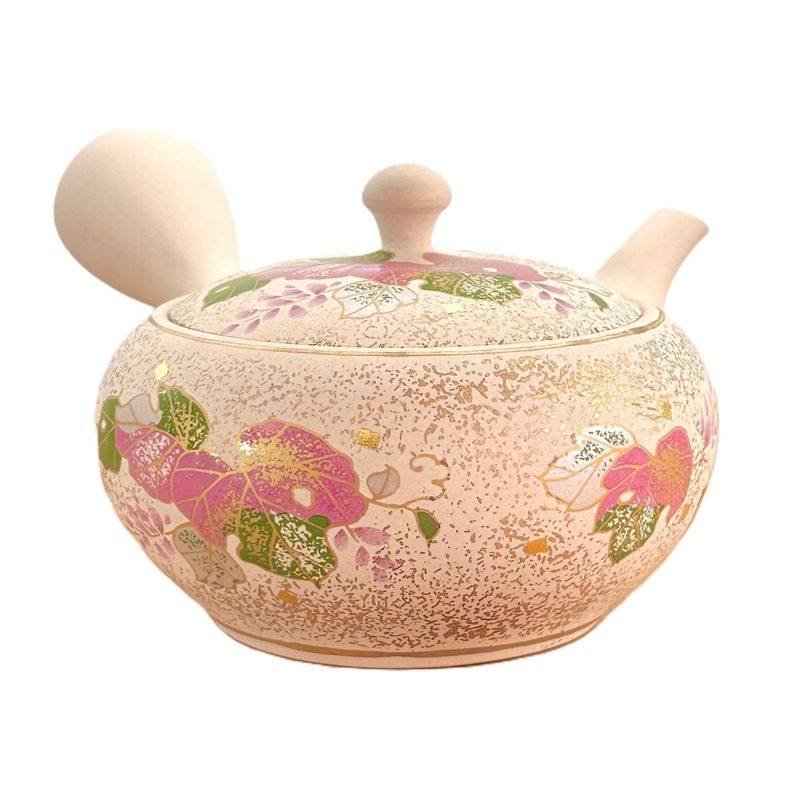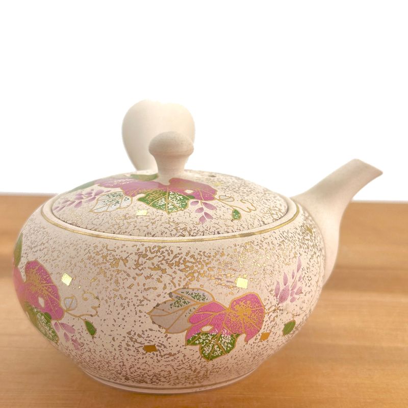 這款茶壺採用稀有的白色黏土製成,這在常滑陶瓷中相當罕見,並以九谷風格手繪設計裝飾。白色黏土增強了茶的顏色可見性,而表面設計融合了優雅和魅力。